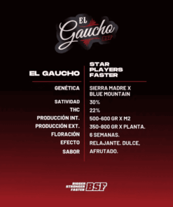 El Gaucho Faster Flowering es el resultado de un cruce impecable entre dos grandes variedades: Sierra Madre x Blue Mountain. El resultado es una genética única, estable y muy resistente a plagas y hongos, lo que la convierte en una verdadera joya tanto para cultivadores novatos como experimentados, ofreciendo grandes cosechas en tiempo récord.