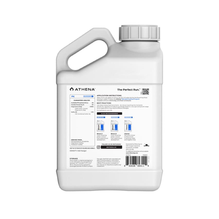 Athena PK es un potenciador líquido limpio y sin nitrógeno, diseñado para complementar los fertilizantes Bloom durante la floración media y tardía. Aporta el fósforo (P) y el potasio (K) adicionales que las plantas de alto rendimiento necesitan, pero con una biodisponibilidad equilibrada. Esto evita los problemas de exceso de sales y maximiza la producción de aceites esenciales y terpenos sin comprometer la absorción de Calcio y Magnesio.